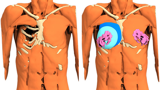 - Dissektion mit geringer Blutung, die es ermöglicht, einen Hohlraum in Kontakt mit der Brustwand zu schaffen,