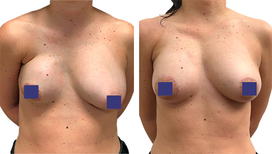 Vorne wird eine neuer, größerer Hohlraum für das neue weiche, mit Silikongel gefüllte Brustimplantat geschaffen. Remodellierung der tuberösen und ptosierten linken Brust mit periareolärer Dermo-Mastopexie.