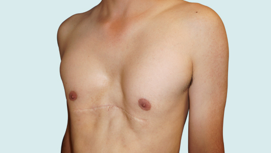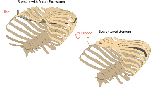 Patienten, die sich nach einem Eingriff mit der Nuss- oder Ravitch-Technik vorzeitig einen Bügel(7) entfernen lassen mussten oder mit den morphologischen Ergebnissen(8) unzufrieden waren, können von der 3D-Implantattechnik nach Maß als sekundäre Chirurgie profitieren.
