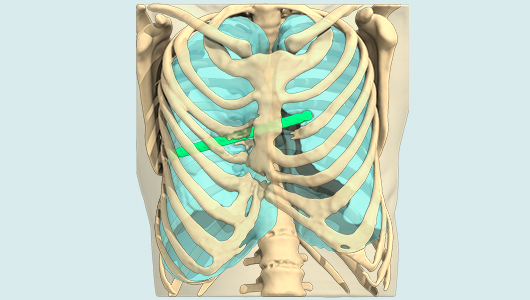 Die 3D-Implantattechnik nach Maß ermöglicht es, die Vertiefung im Brustkorb zu füllen, ohne den Brustkorb zu berühren, sei es als erste Option oder um das Versagen einer anderen Technik zu korrigieren(6), zum Beispiel orthopädische Techniken (Nuss oder Ravitch). Wenn der Nuss- oder Ravitch-Bügel noch in Position ist, sollte er vorzugsweise vorher entfernt werden. Das Protokoll ähnelt in der Folge einer klassischen Operation der Trichterbrust mit maßgefertigtem 3D-Implantat: